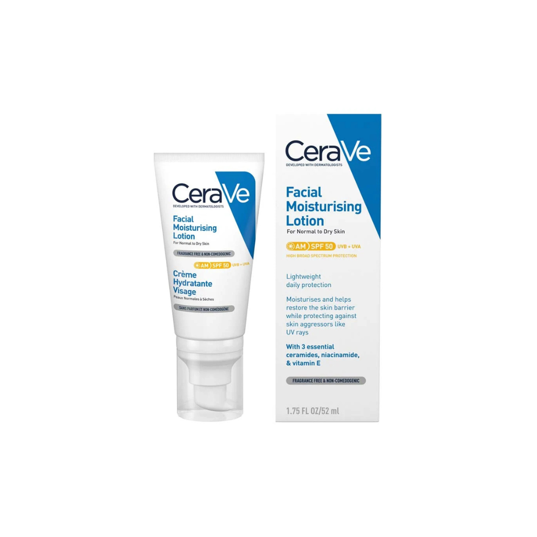 CeraVe AM Facial Moisturising Lotion SPF50 is a daily lightweight facial moisturiser, with SPF 50+ UVB/UVA protection, hyaluronic acid and 3 essential ceramides, helping to protect the skin’s natural barrier and leave skin feeling soothed and hydrated for up to 24 hours.