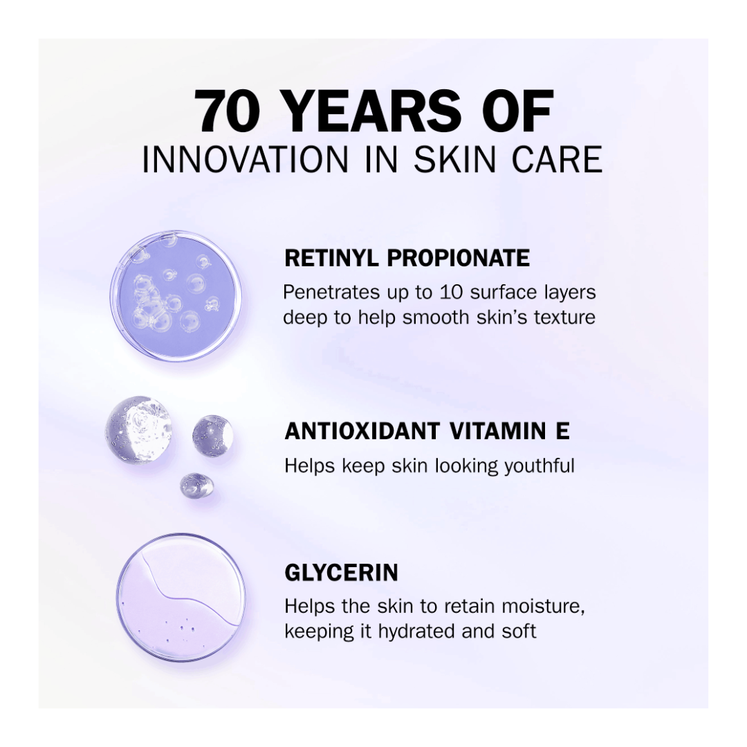 Supercharged with Retinyl Propionate that penetrates deep to smooth skin texture and antioxidant Vitamin E that helps keep skin looking youthful