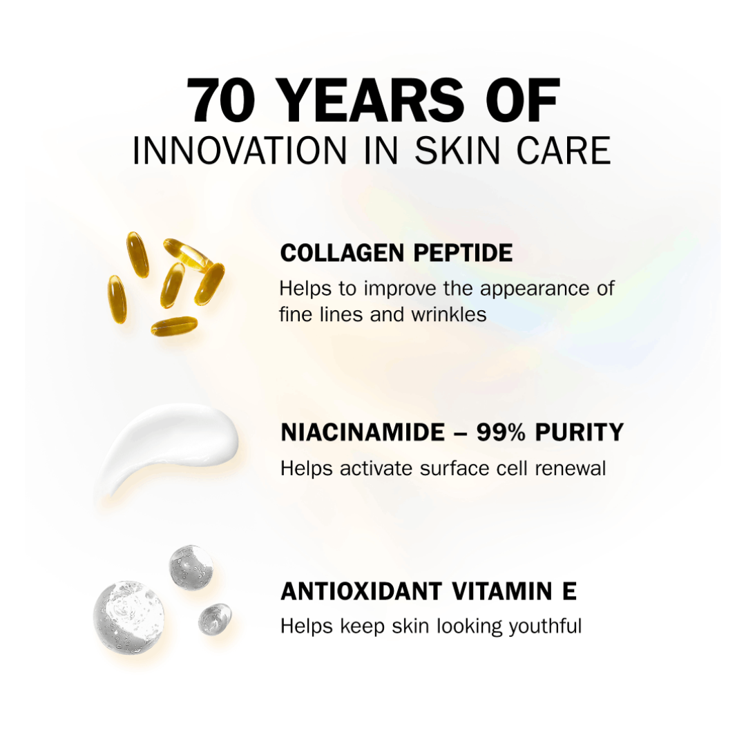Supercharged with Collagen Peptide, that helps improve the appearance of fine lines and wrinkles and 99% pure Niacinamide, that penetrates deep into skin's surface