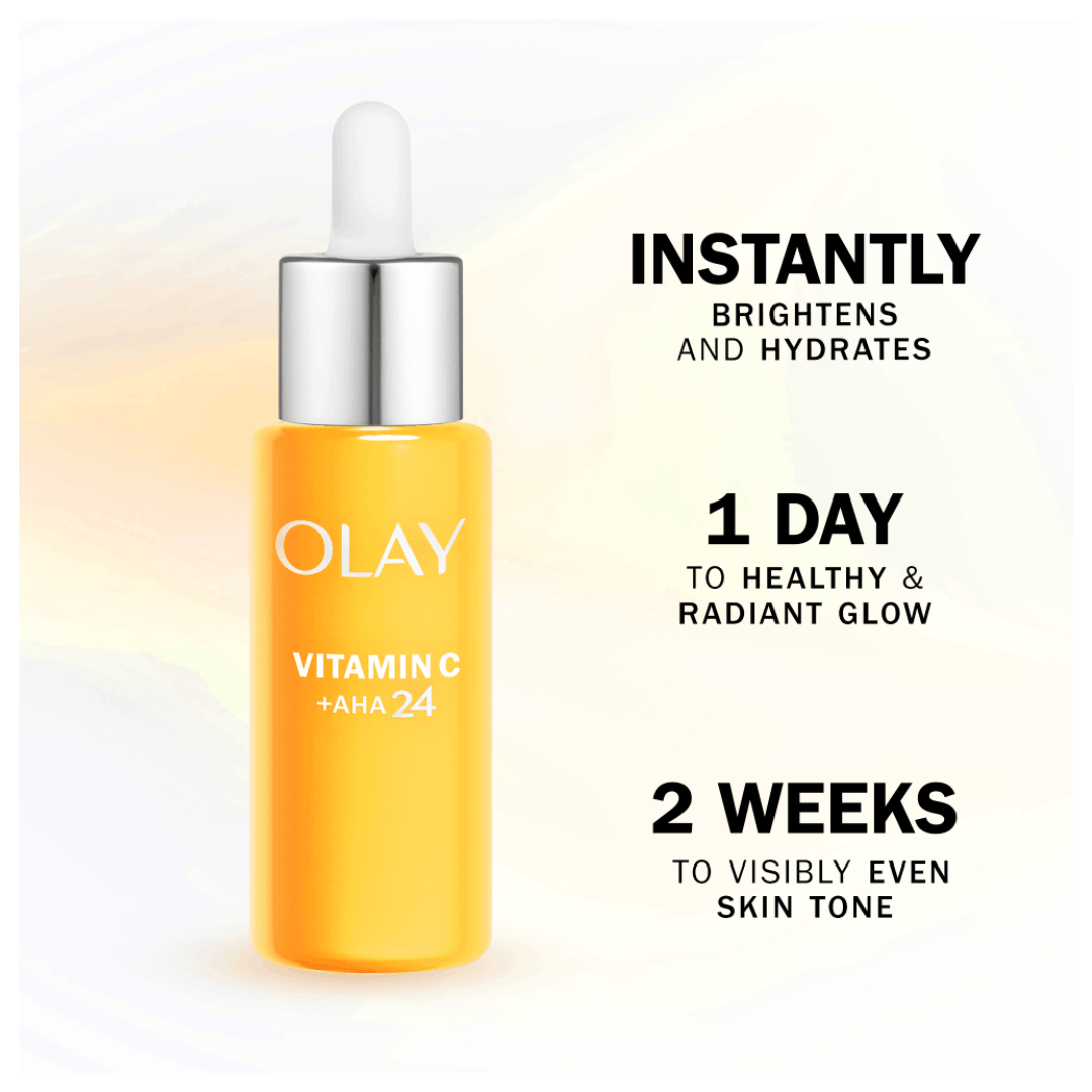 Brighten up your skin with Olay Vitamin C +AHA24 serum! The power of a triple action: anti-dark spot, even, 24h hydrate