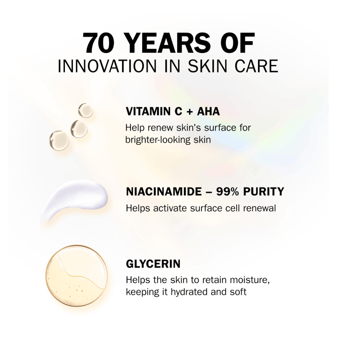 Supercharged with Vitamin C +AHA, that helps renew skin's surface for brighter-looking skin and 99% pure Niacinamide that penetrates deep to help activate surface cell renewal