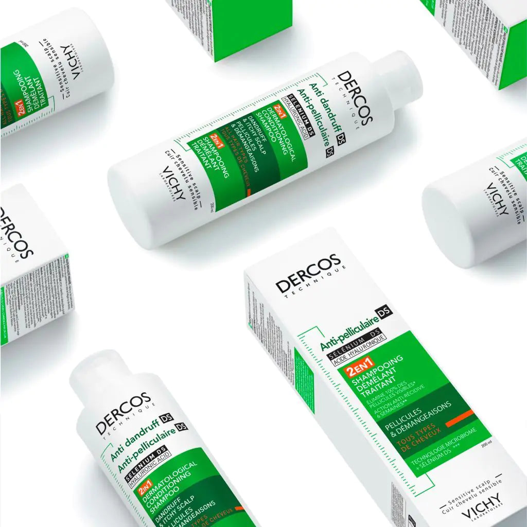 Vichy Dercos Anti-Dandruff DS 2in1 Shampoo + Conditioner is a dermatologically endorsed treatment designed to address dandruff and scalp issues. This innovative 2-in-1 formula combines the cleansing power of a shampoo with the nourishing benefits of a conditioner, ensuring your scalp and hair are treated with the utmost care. From the first wash, it eliminates up to 100% of visible flakes and provides long-lasting dandruff protection for up to six weeks. Enriched with hyaluronic acid, this shampoo nourishes and hydrates, leaving your hair shiny, soft, and tangle-free.